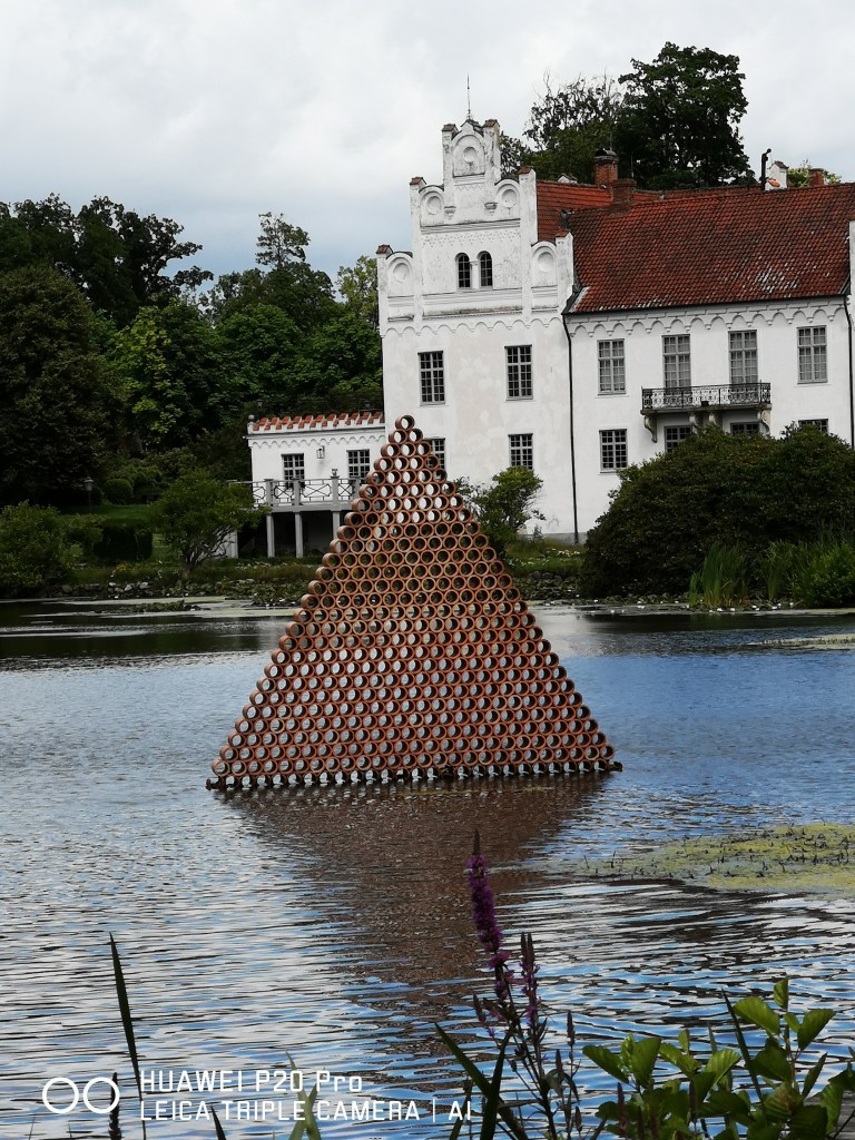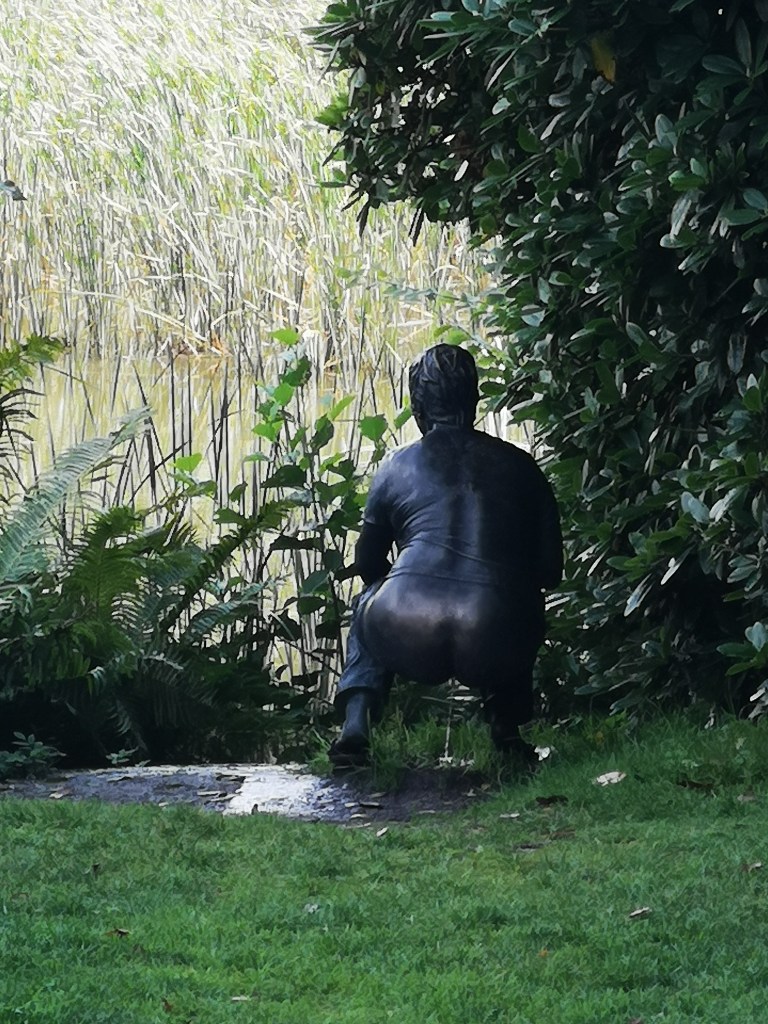 Vid Yoko Onos fasta installation finns en härlig plats att äta sin medhavda fika. Tyvärr är det ganska djup grus på denna plats så själv sprutade jag detta år grus som värsta ”Epatraktorn på driftinghumör”. Men med en välvillig knuff av en son kom jag loss. Varje år har skulpturparken några nya installationer som då bara finns där det året. Samt alla fasta installationer som man känner igen från år till år. Vissa av dem blir ”gamla vänner” nästan. Den kissande kvinnan vid sjön till exempel. Eller Vildsvinet byggt av vedstaplar.