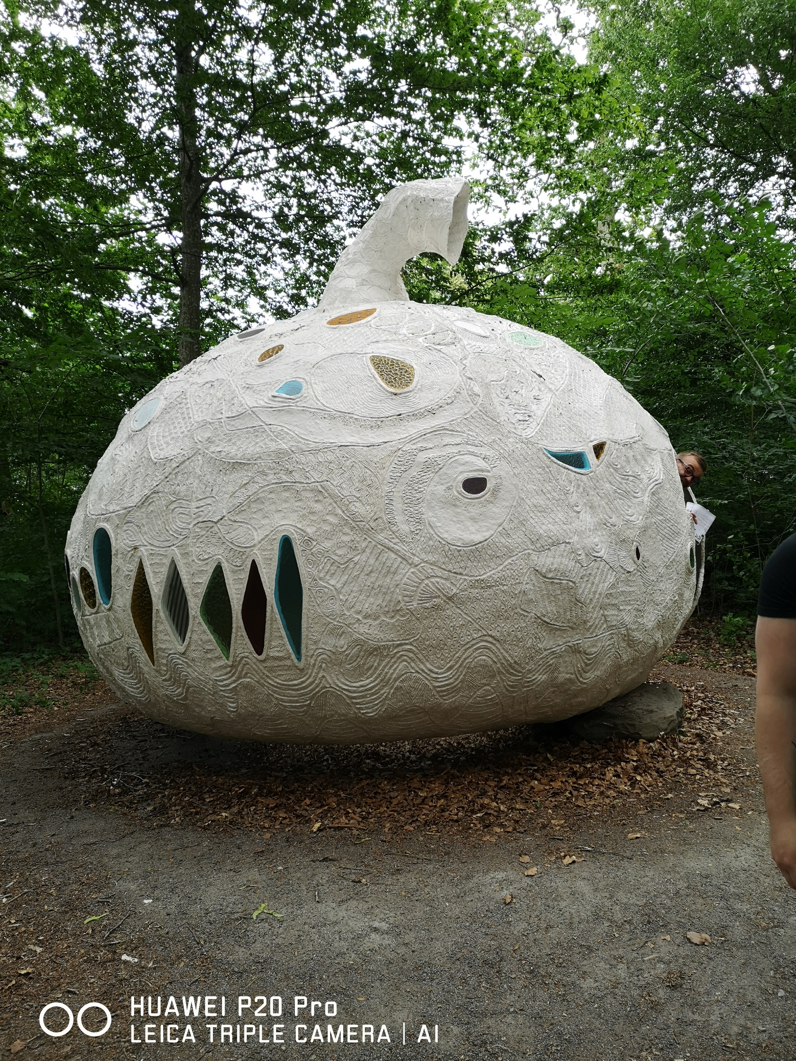 Tanken var att jag skulle kunna gå med den i rollatorform så länge jag orkade för att sedan bli framknuffad i rullstolsläget. Det gick någorlunda då ”mitt gäng” består av starka killar. För Rollz Motions hjul rullar helst på asfalt eller andra släta ytor. Wanås har skogsstigar. Visserligen finns några av konstinstallationerna inomhus men de är i minoritet. I år (2023) hade jag med mig min lilla privat-köpta hopvikbara promenadscooter. Min stora scooter som Region Skåne förskrivit är alldeles för stor och tung för vår lilla bil. När jag använder den behöver jag åka färdtjänst. Eftersom vi skulle ha hundarna med och dessutom inte visste när vi ville åka hem såklart, blev det självklara valet den lilla scootern. Det ösregnade när vi var på väg dit. Alla hade kläder efter väder och jag hade en stor regncape som kunde täcka både mig och scootern. Men det blev endast en kort stund i regn innan vädret förbarmade sig över oss. Dock hade stigarna blivit leriga. Personalen på Wanås erbjöd oss att låna en golfbil! Så fin service. Men vi tog chansen att använda mina egna hjul. Dessutom, eftersom det var lågsäsong ,erbjöds vi att ta med både lilla scootern och hundarna in i cafeet om vi ville. Alla vi mötte var verkligen väldigt hjälpsamma. Ett exempel var när jag berättade att jag var lite virrig av min strokefatigue men att maken stod utanför med hundarna så jag tänkte klara att betala i butiken själv då tog de sig noga tid att förklara och peka.