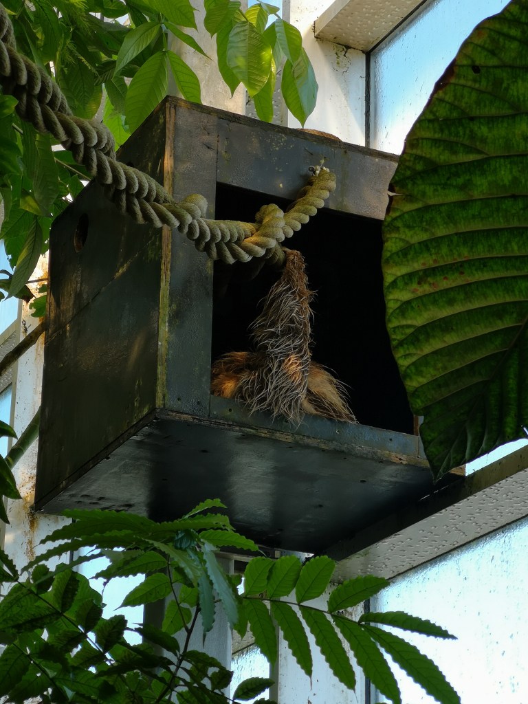Nå, jag kunde lätt ta mig fram och insåg att ett nytt besök, en vardag då barnfamiljerna troligen var färre, kommer genomföras. Det är en spännande plats med både havsdjur, tropisk djungel och bra pedagogisk tanke. Min man njöt av alla fåglarna i Tropiska djungeln. Ja, han har alltid varit en fågelnörd. Det finns nog inte en fågel man kan få tag på som han inte haft eller fött upp. Vi pratar Struts, Amazonpapegojor, Höns( det har jag också haft) Ankor, Vaktlar, Loris, mm. Själv kunde jag känna igen mig i Sengångaren! Jag hänger visserligen sällan i lianer och rep men tar det ju också väääldigt lugnt numera.
