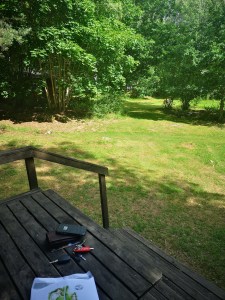 Fy, vad jag ville åka hem redan efter första natten! Jag hade ont i varenda cell i min kropp. Satt på stol, gungade framför fönstret och hade nästan panik. Naturligtvis låg jag i nedre slafen i våningssängen men den var mer dimensionerad för yngre personer( typ under tolv, fniss) och då det var lågt mellan våningarna så kunde jag inte sätta mig upp ens. Så på morgonen funderade jag på om maken skulle köra mig och hundarna hem för att sedan återvända till stugan och fiska dag två och tre också men ju längre dagen gick ju kaxigare blev jag. Jag ville ju också njuta av naturen, rulla runt i omgivningarna lite och läsa. Kanske skriva lite och vila! Vila för att hemma har jag så svårt att inte se allt jag borde göra men inte klarar längre! I stugan fanns inga ”Måsten” som kunde ge mig dåligt samvete. Tog in den bekväma solstolen( BadenBaden) som jag tagit med för då kunder jag ju rotera mellan sängen och den för att avlasta kroppen. Det fungerade ganska bra. Jag fick naturligtvis betala hårt för vistelsen en hel vecka efter hemkomst men det blev det faktiskt värt. Till stugan är det en ganska brant backe och tre trappsteg. Men det gick ju att ta sig dit med hjälp av gubben. Värre var ju då han var och fiskade och jag behövde eller ville ut och röra på mig lite. Det ösregnade två av dagarna så själva backen upp till vår stuga blev oerhört lerig. Även en fullt fungerande människa gav sig ner för den med riska för vurpa. Men en av kvällarna kunde vi ändå grilla på den fina stora grillplatsen nedanför stugan. Det kändes nästan som innan. Då ,när jag var fullt rörlig och vi campade, vandrade och var ute i naturen.