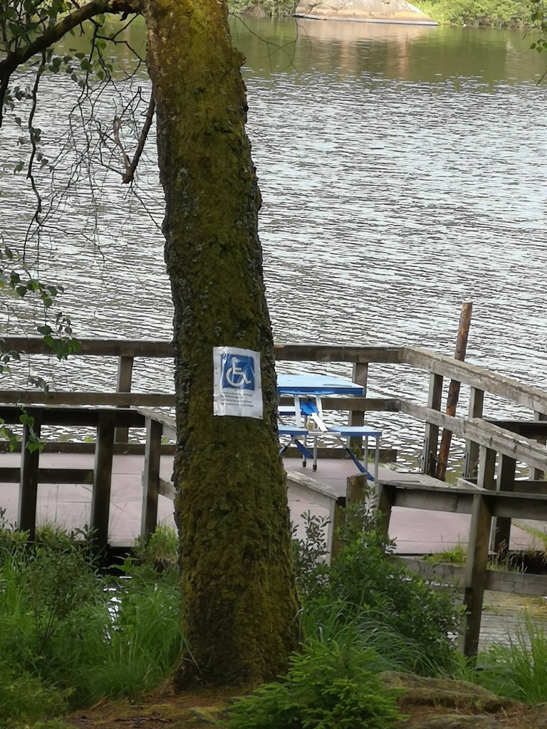 De fanns även badmöjlighet i en av sjöarna nära Fiskecampen. Det var inte aktuellt att testa detta ställe då vädret var delvis ruskigt. Men när vi körde förbi med bil såg det inte ut som att det är så lätt att bada där med rörelsehinder. Detta ska jag kolla upp lite närmre när vi åker hit nästa gång eftersom jag älskar att bada och gärna vill kunna fortsätta ta ett dopp trots ”knickedickighet”. Har du varit där? Hur upplevde du tillgängligheten? Vi kommer som sagt troligen besöka Harasjömåla igen men då kommer vi planera helt annorlunda. Vi kommer boka en av stugorna som har toa och dusch åtminstone. Eftersom jag periodvis kan gå med käpp, beroende på hur kroppen mår, är det lätt att jag lurar mig själv med att ”Jodå, visst kan jag bo med några trappsteg eller i en stuga som inte är tillgänglighetsanpassad. Jag har lite ”svårt med självinsikten” som läkaren försiktigt beskrev det då jag babblade på om allt jag vill göra då kroppen bara blir ”lite” bättre. Jag vill mer än kropp och knopp förstår. Det är nämligen en lång och svår process för mig att acceptera att jag inte blir bättre utan snarare sämre. Att fokus bör ligga på att inte förlora den rörlighet jag nu har. Men därmed sagt låter jag inte bli att sätta nya små mål! Jag har köpt ett alldeles eget fiskespö! Ett cerise! För det finns ju en brygga som är rullstolstillgänglig. Med picnicbord och allt. Så oavsett om det blir käpp, rollator, scooter eller rullstol kommer jag nästa gång dra upp Monsterfirren som slår alla Rekord! Eller??? Tar med en bra bok också.