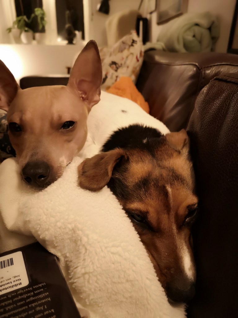 Ja, det blev så roligt! Jag har nog inte skrattat så mycket på fem år som jag gjorde på en dag i jul. Maten blev god. Litet klassiskt Julbord på julafton och vildsvinsstek och rådjursstek på juldagen. Berg av rester i kylen så en stor fördel är att vi inte behöver fundera över vad vi ska äta på ett bra tag framåt. Vi lekte små lekar, spelade spel och pratade. Tittade på tv lite då och då. Sönerna somnade i sina älsklingars famnar i soffan från och till. Hundarna fick gottor och leksaker och somnade huller om buller på de små hörnor av soffan som inte upptogs av människor.